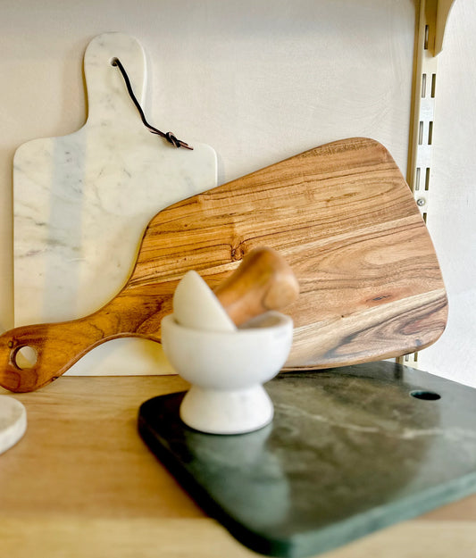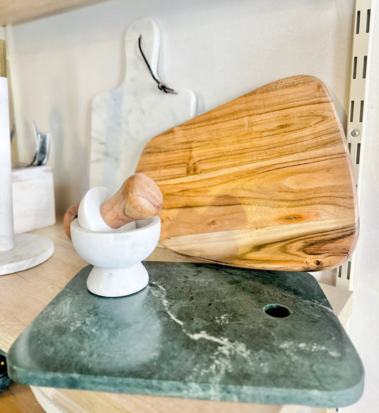 Plato de apoyo para cocina de marmol gris con cuchillo de madera