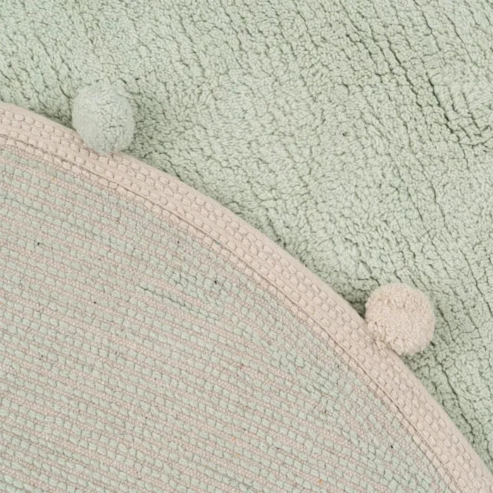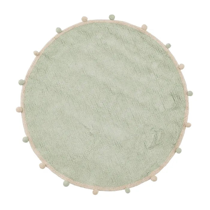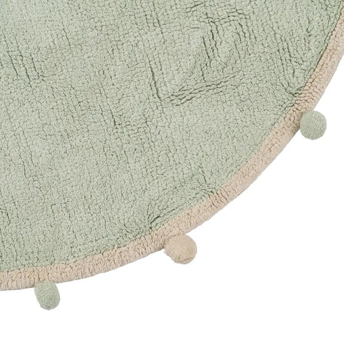 Alfombra infantil redonda con pompones en tono salvia.