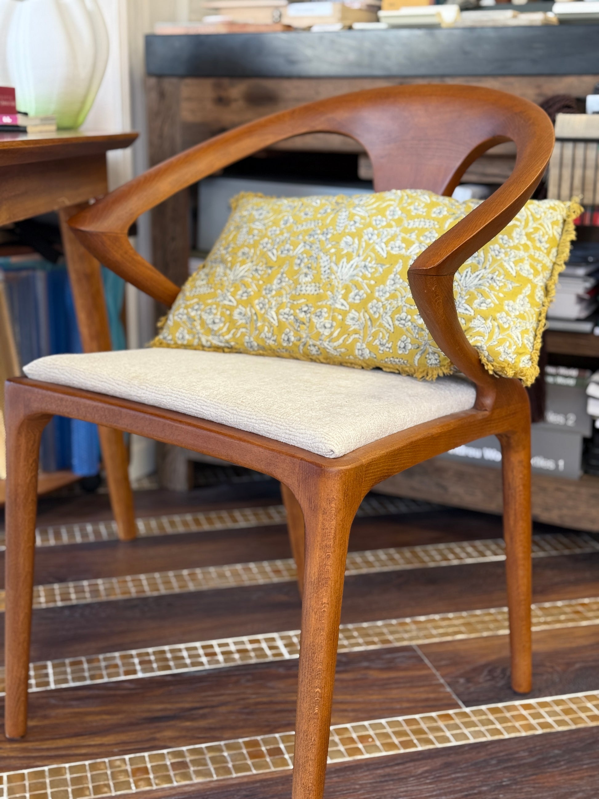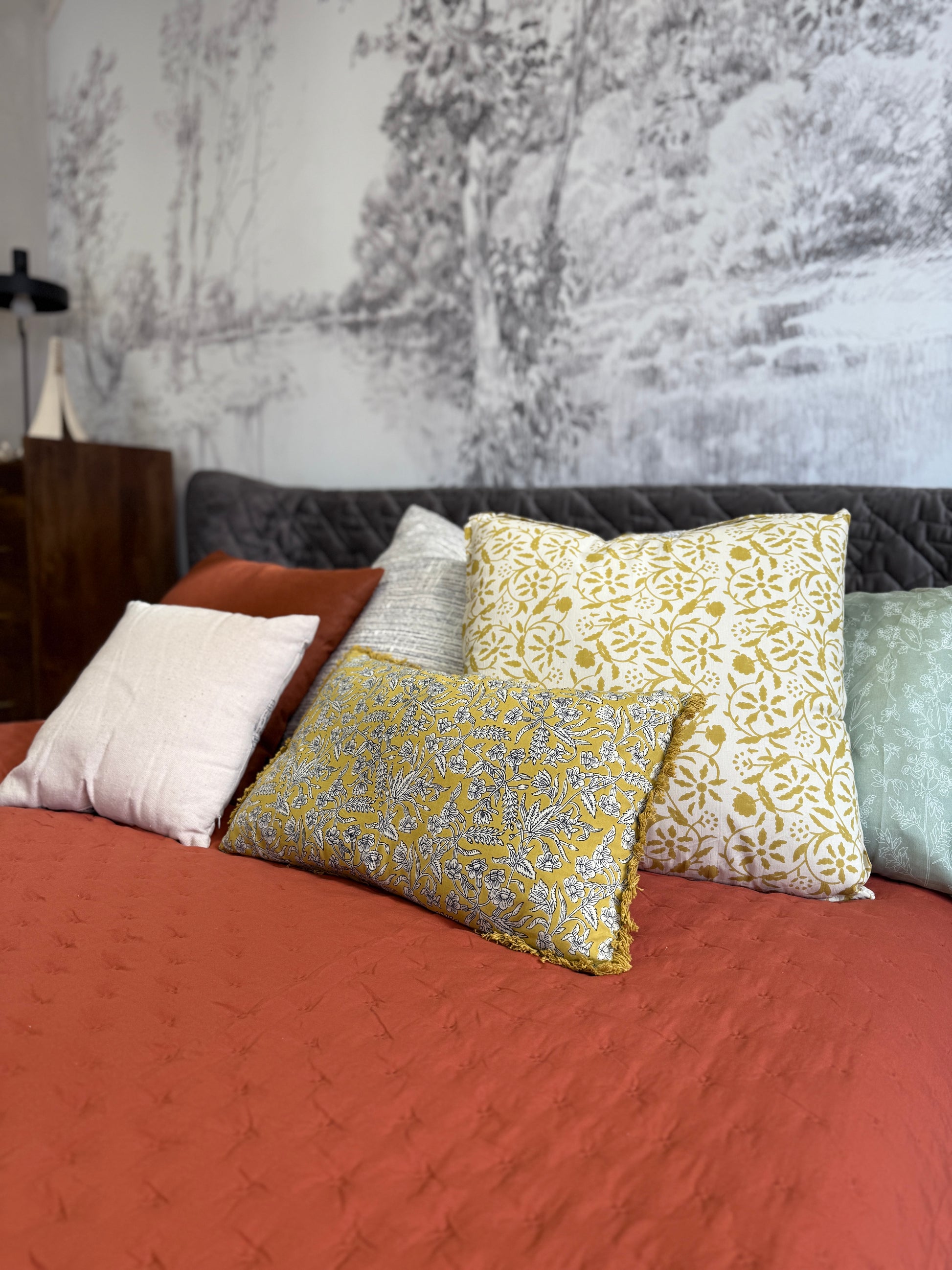 Cojín rectangular estampado beige-mostaza con marcado en negro de los motivos florales, un cojín romántico perfecto para tu sofá, esa butaca que te encanta, las sillas que no son tan cómodas de respaldo como deberían y camas nostálgicas.