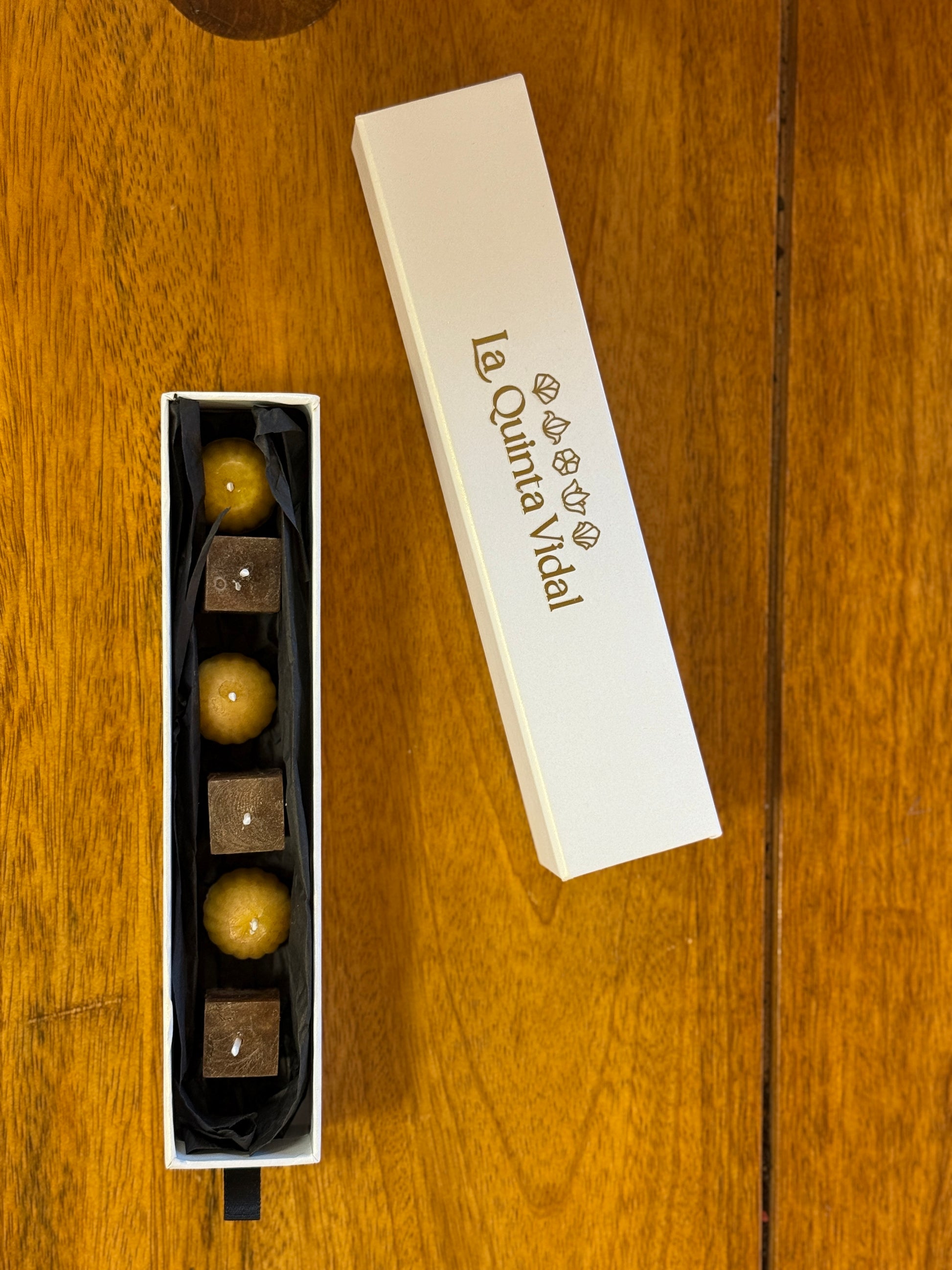 3 velas decorativas realizada en cera de parafina con forma de mini cubito bombones de chocolate de 2 x 2 cm con mecha y aroma a chocolate y 3 velas con forma de bombón amarillo anaranjado, de 2x2 con mecha y aroma a canela y naranja , en una preciosa cajita blanca iridiscente. Perfecto para regalar o regalarte.