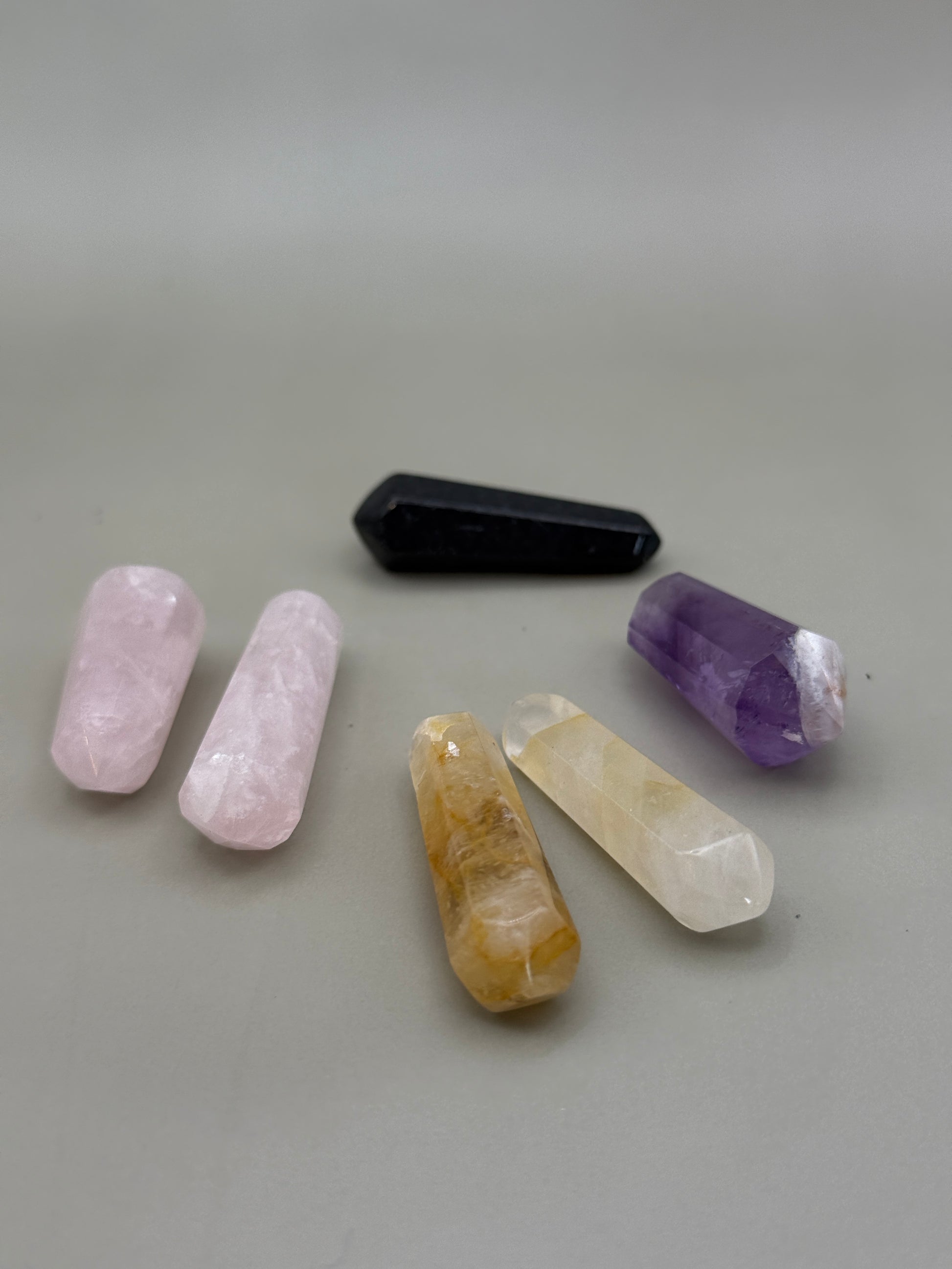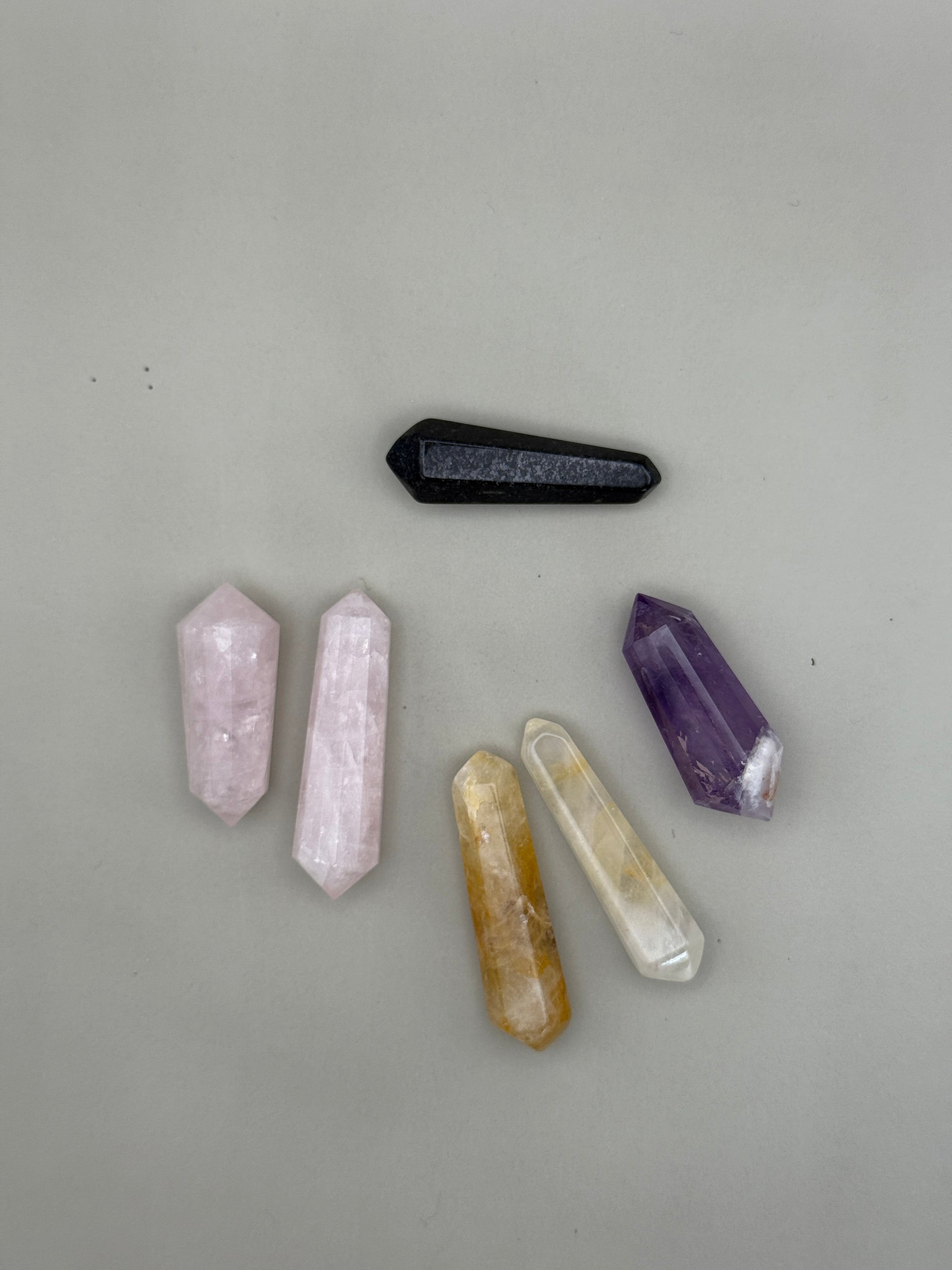 Los biterminados, como su propio nombre indica, son generadores que tienen dos puntas, una a cada extremo. Se utilizan para enfocar la energía y la sanción, porque su forma permite actuar como puente y conectar y canalizar la energía entre dos puntos, como por ejemplo dos chakras o dos personas.