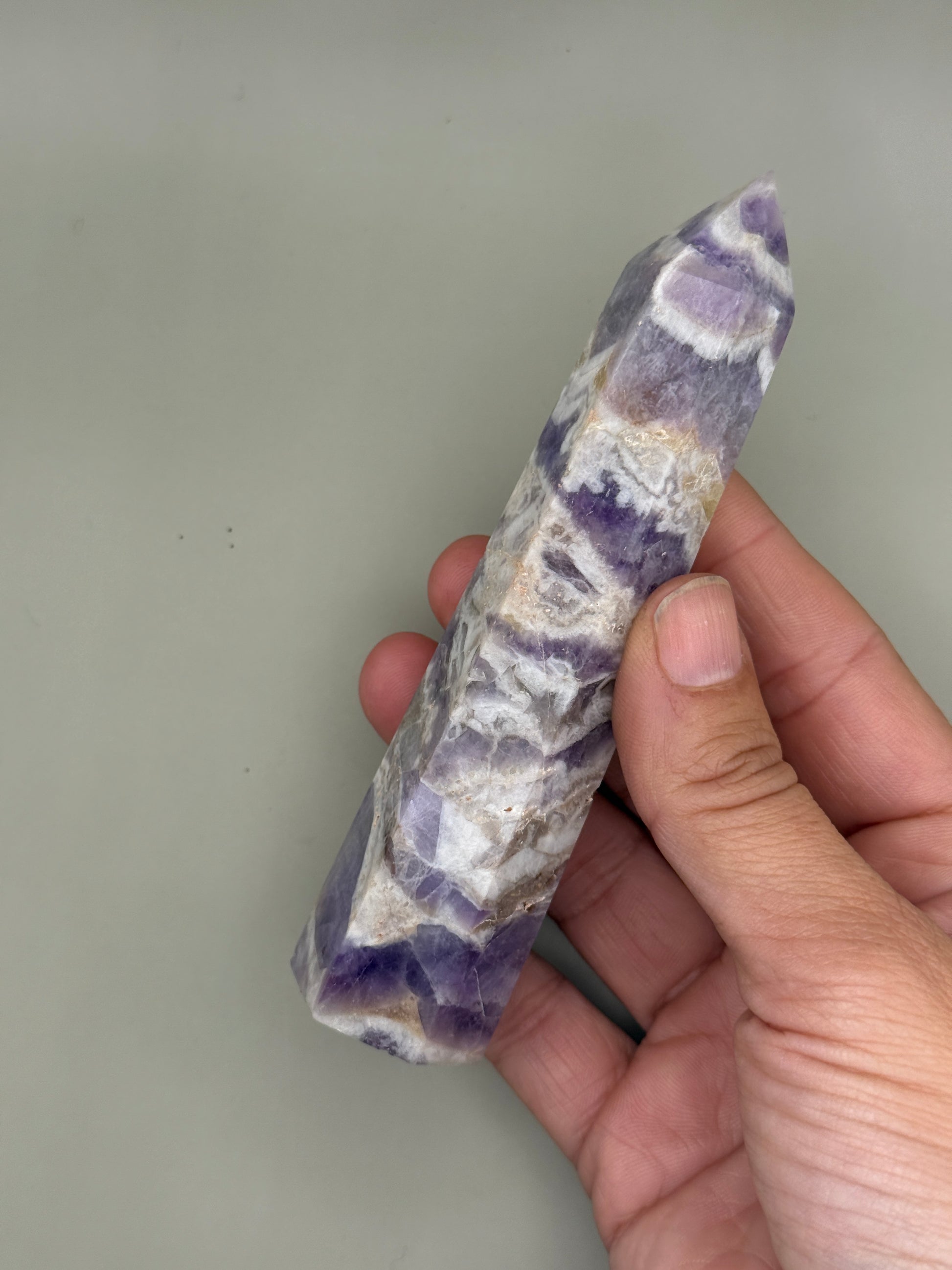 - Mineral: Amatista Chevron clara, punta generadora pulida calidad A+