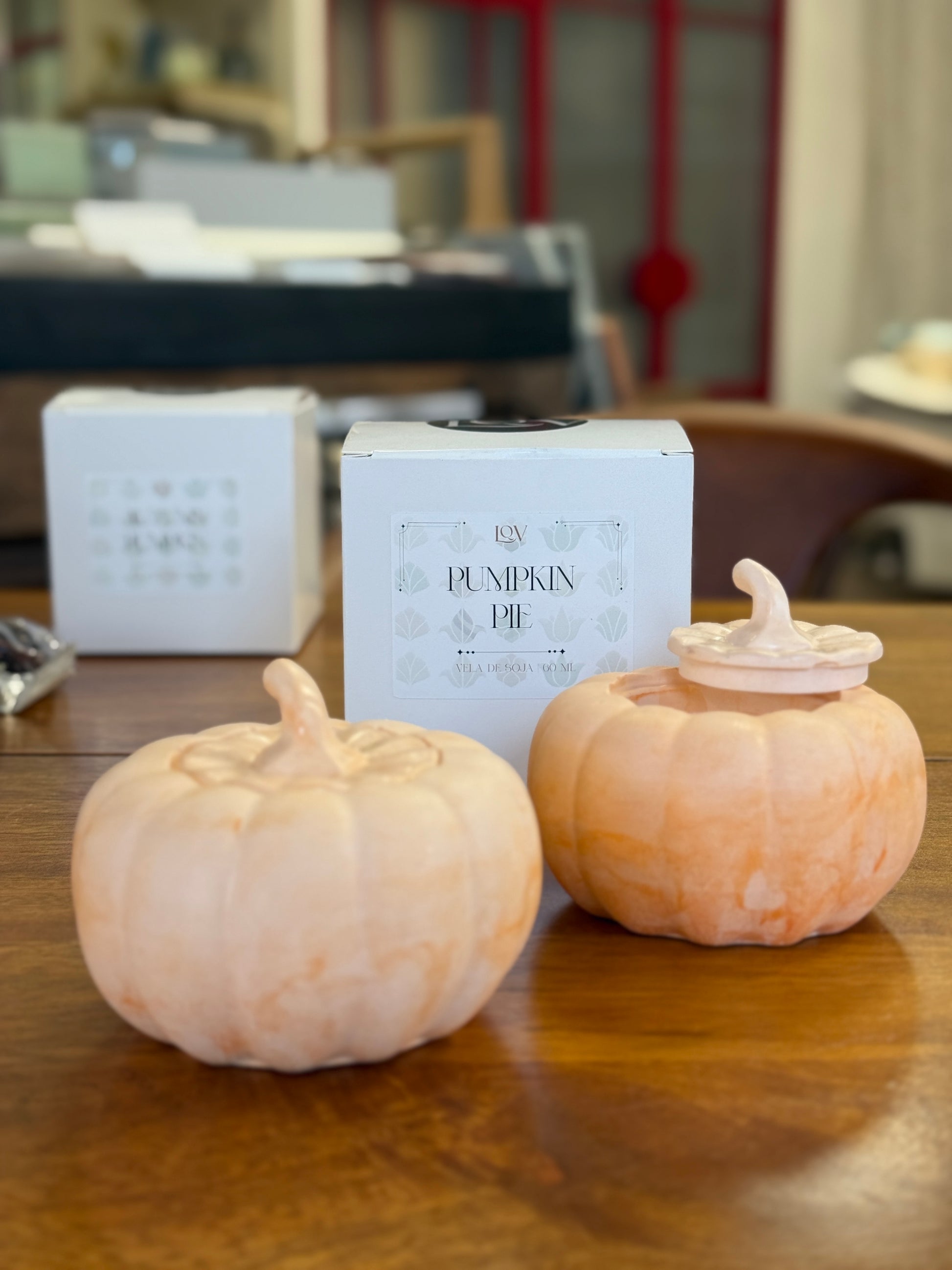 Una vela realizada en cera de soja natural con aroma a Calabazas horneadas con miel, naranja y piña en tamaño de 60 ml en envase de resina ecológica realizado artesanalmente con tapa en forma de calabaza y una mecha.